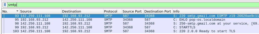 Constructing a wireshark filter for ip.addr==142.250.111.108, I can find the TCP handshake in frames 83, 85 and 86. SMTP typically uses TCP for the transport protocol. Once the connection is made, the SMTP application can leverage it to send SMTP traffic (which we start to see in frame 93 above).