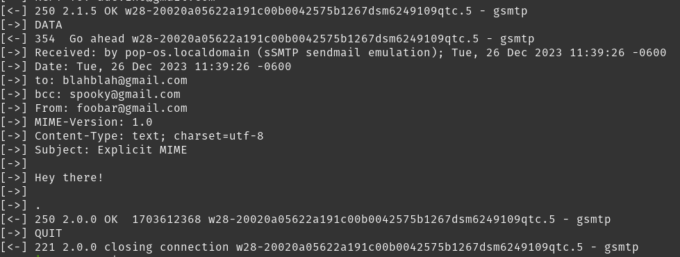Thanks for reading. We introduced Simple Mail Transport Protocol, learned how to send mail from our computers, and looked at the protocols involved when the message is sent. This enables us to look for patterns in other wireshark captures where we don’t have an ssmtp output with us. We also took a deeper dive into the message that is sent over SMTP and discovered that using an explicit MIME type we can change how the message is presented in gmail.