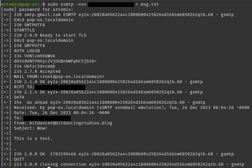 [2] Shows step-by-step directions for installing a linux smtp client (ssmtp) and configuring it to send to your google smtp server. There’s an update, mostly driven by the rise in 2-factor authentication. I’ve included my test setup.