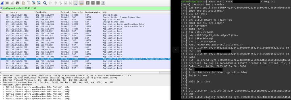 For the next bit, it’s useful to look at the ssmtp output alongside the wireshark output. We will see that after TLS is established, there are commands better shown in ssmtp while wireshark shows “Application Data” packets. This is to be expected because wireshark is looking at an interface overwhich encryption has been establisehd between the client and server applications.